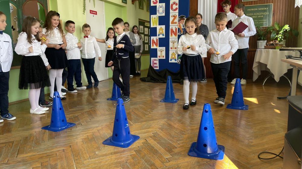 Kolejnym punktem programu były "otrzęsiny" naszych najmłodszych przygotowane przez Samorząd Uczniowski. Pierwszoklasiści poddani zostali licznym próbom sprawnościowym, rozwiązywali zagadki oraz pili sok z cytryny, po którym musieli uśmiechnąć się od ucha do ucha. W nagrodę za doskonale wykonane zadania otrzymali upominki.