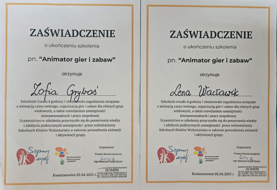 2 kwietnia 2025r. w Budynku Towarzystwa Gimnastycznego "Sokół" w Gorlicach odbyły się wyjątkowe warsztaty pn. "Animator gier i zabaw". Skierowane były do wolontariuszy szkolnych klubów wolontariatu z powiatu gorlickiego. W tym wydarzeniu wzięły udział nasze uczennice: Lena Wacławik z klasy 7 oraz Zofia Gryboś z klasy 6. Wszyscy uczestnicy mieli okazję zdobyć praktyczną wiedzę oraz mnóstwo inspiracji do prowadzenia kreatywnych zajęć i integracyjnych zabaw z dziećmi i młodzieżą. To był dzień pełen uśmiechu, zaangażowania i pozytywnej energii!